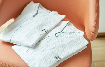 ふわふわのワッフル生地の触り心地と、2ピースで上下がセパレートになっている動きやすいホテルオリジナルパジャマをご用意しております。