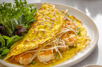 「バインセオ」は主に南部の屋台やお店で庶民に食べられている「ベトナム風お好み焼き」です。生地は米粉から作られており、ターメリックによって黄色いのが特徴です。皮の周りは薄くパリパリに焼かれますが、中心はもっちりとしていて2つの食感が楽しめます。豚肉やエビ、もやしなどの野菜をたっぷりのせて焼き上げ、甘酢タレをつけて食べます。不足しがちな野菜もたっぷり摂れるヘルシーな一品です。