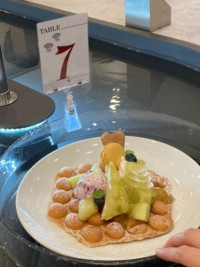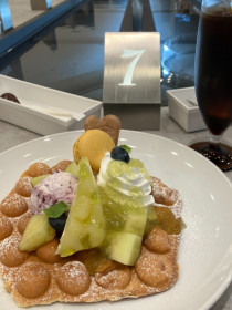 夏季限定「メロン バブル ワッフル」は、外はサクッ、中はフワッのワッフルに、洋梨とぶどうのケーキ、ブルーベリーアイス、レモン風味のマカロン、たっぷりのホイップクリームをオン。