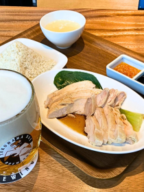 人気のフードメニューは「シンガポールチキンライス」。食べ応えのある大山どりのムネ肉・九州産モモ肉に、スパイシーな2種のソースを絡めて。生姜の効いたジャスミンライスもクセになるおいしさ。