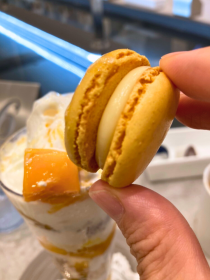 「マンゴー ジャーニーパフェ」には、完熟マンゴーやコロンとかわいいマンゴーマカロンをトッピング。ソフトクリームの下にはマンゴーレアチーズケーキが登場し、食べ応え満点です。