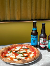 水牛のモッツアレラのクリーミーなコクが後引くおいしさの「水牛のマルゲリータ」。まだまだ暑いこの時期、フルーティーで爽快なクラフトビールがピッタリです。