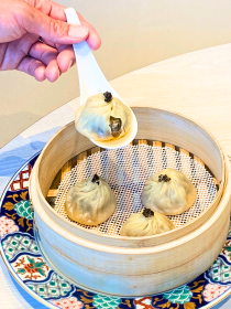 できたての小籠包は熱々のためレンゲにのせ、箸で皮を破いてスープから味わうのが良いそう。餡にトリュフを練りこみ、さらに蒸しあがり直前に小籠包にトリュフをのせ、香りまで楽しめます。