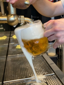 注文後グラスいっぱい、なみなみと注がれるビール。世界的に権威のあるビールの品評会で、2024年に金賞を受賞した「ゆずヴァイス」は、お店イチオシ!神奈川県産ゆずを使用した果実味豊かな味わいです。