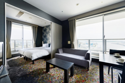 当ホテルで最も広く、お台場や湾岸の夜景を臨む海側に面したお部屋です。リビングルーム、キッチン、洗濯機を備えており、リビングルーム・ベッドルームそれぞれから眺望をお楽しみいただけます。