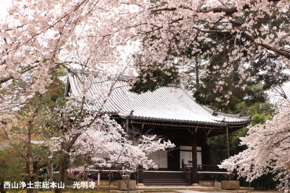 西山浄土宗の総本山である光明寺は、長岡京市西山のふもと、粟生広谷に位置しています。この地は法然上人が日本で初めて「南無阿弥陀仏」の念仏の教えを説かれた場所とされ、深い歴史を有しています。桜の穴場としても知られ、表参道の石畳を上ると、早くも桜が訪れる人々を優雅に迎え入れます。