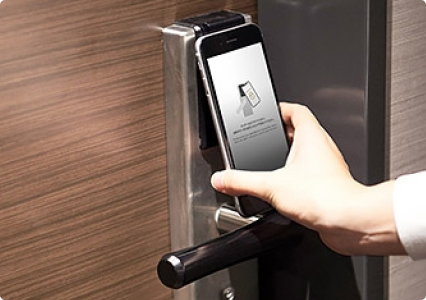 スマホでお部屋の鍵を開けられます。また、ホテルへの入館(深夜1時~5時)やエレベーターの作動にも、ルームキーの代わりにご利用いただけます。