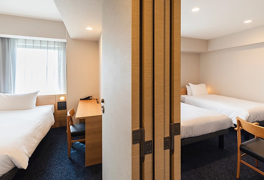隣接するダブルルームとツインルームの間に室内ドアがあり、相互に行き来できる客室です。最大4名様までご利用いただけ、ファミリーやお友達同士でのご利用に最適です。