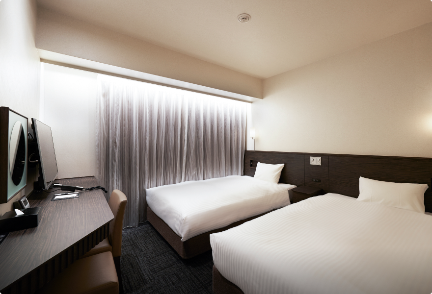 ゆとりの160cmサイズのベッドで安らかな休息をご提供いたします。2名様でのご利用はもちろん、広いベッドでゆっくりお休みになりたいビジネス利用のお客様にも最適です。一部のお部屋ではツインのお部屋とコネクティングとして使用可能となっております。