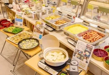 ホテル2階朝食会場にて、フレッサインの日替わりビュッフェ(和・洋食)を1,400円にてお召し上がりいただけます。
