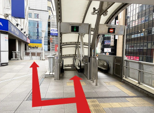 黄色い点字ブロックに沿って、右斜め前方へ進みます。