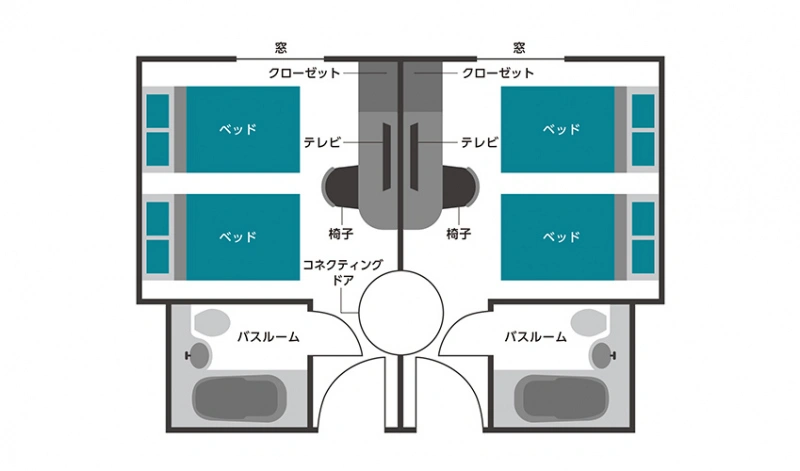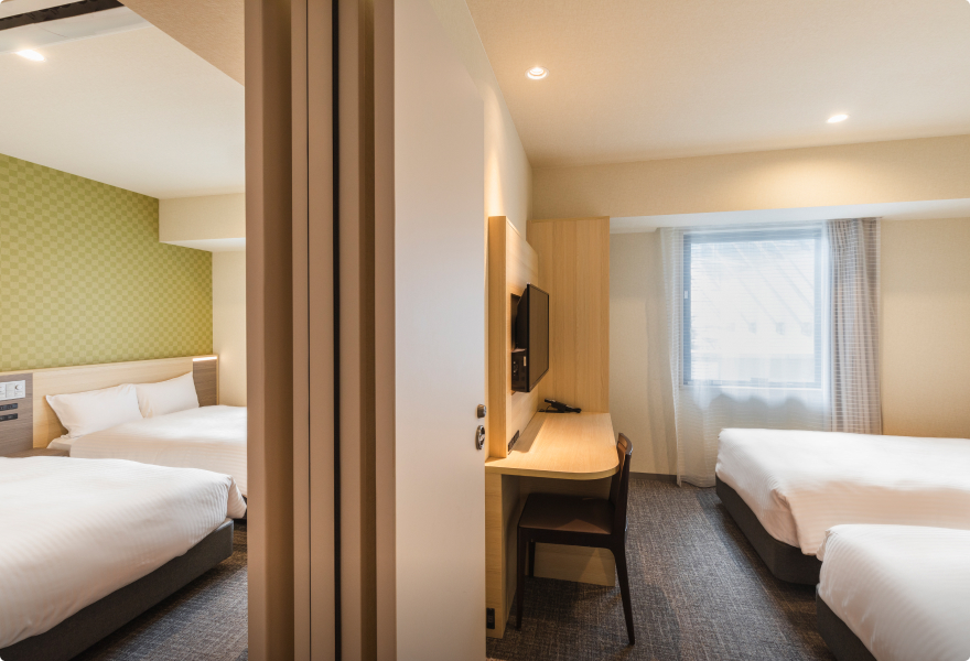 隣接するツインルーム2室の間に室内ドアがあり、相互に行き来できる客室です。最大4名様までご利用いただけます。ファミリーや3世代、お友達同士でのご宿泊に最適です。