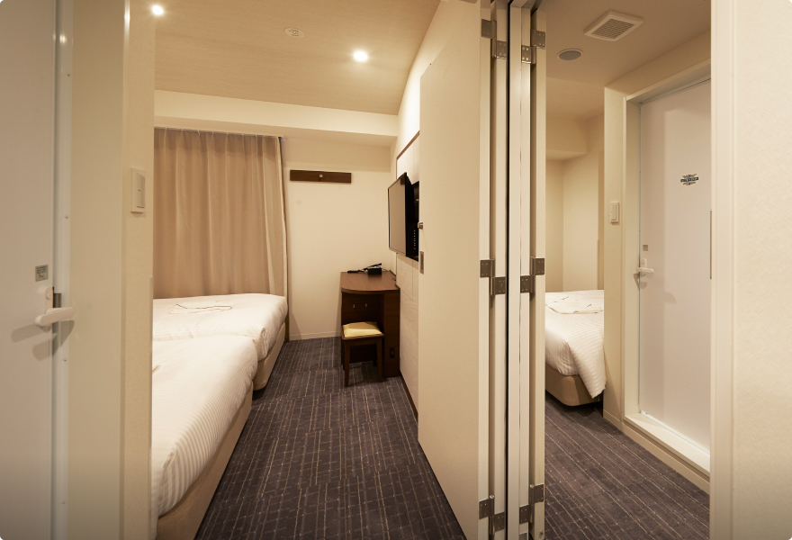 隣接するダブルルームとスーペリアツインルームの間に室内ドアがあり、相互に行き来できる客室です。最大4名様までご利用いただけます。ファミリーやお友達同士でのご宿泊に最適です。