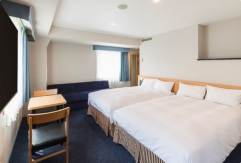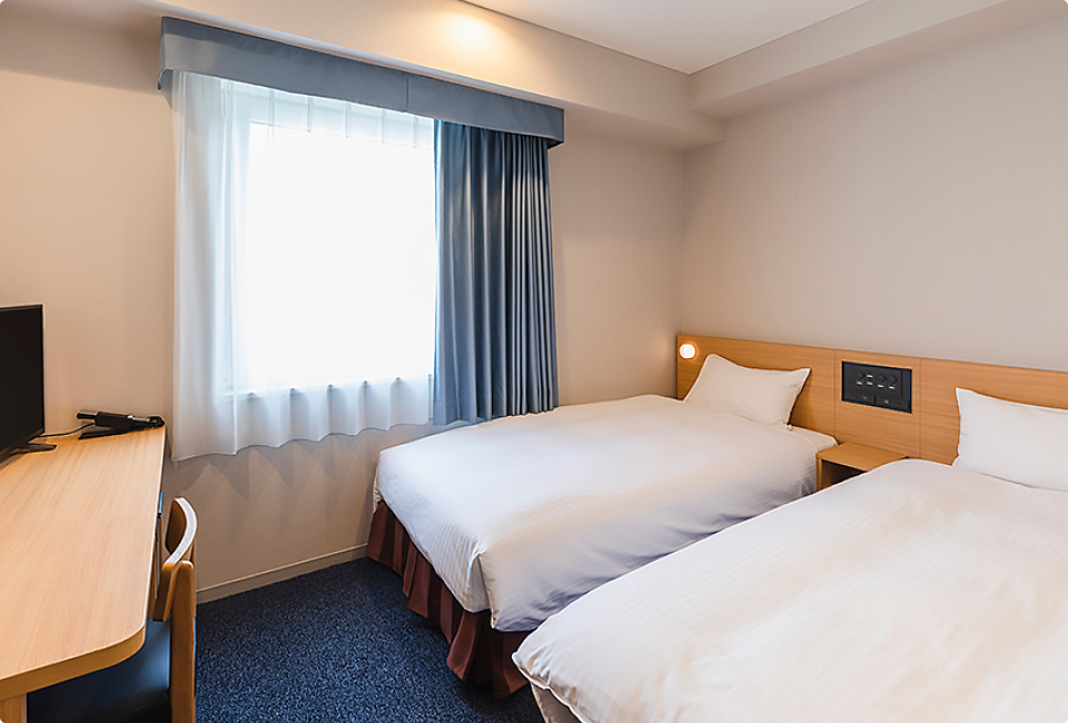 客室は加湿機能付き空気清浄機完備、"良水工房"の浄水システム設置しています。ダブルルームをはじめ、ツインなど多様な客室をご用意しています。