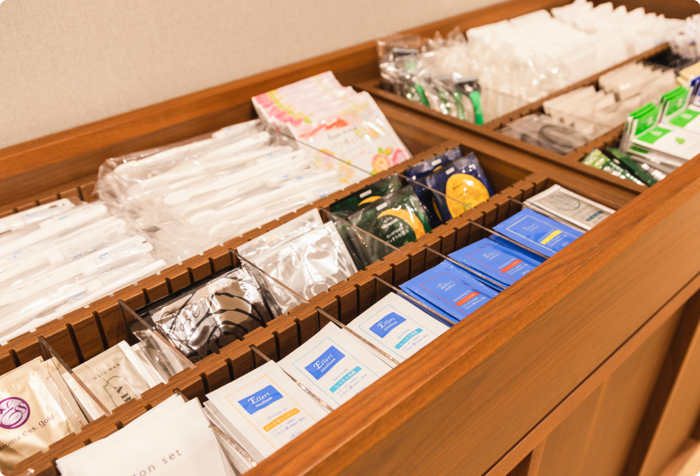 入浴剤、バスソルト、スキンケア・ヘアケアグッズ等、ちょっとうれしいグッズをご用意しております。客室にお上がりいただく前に、お好きなものをご自由にお取りください。 -