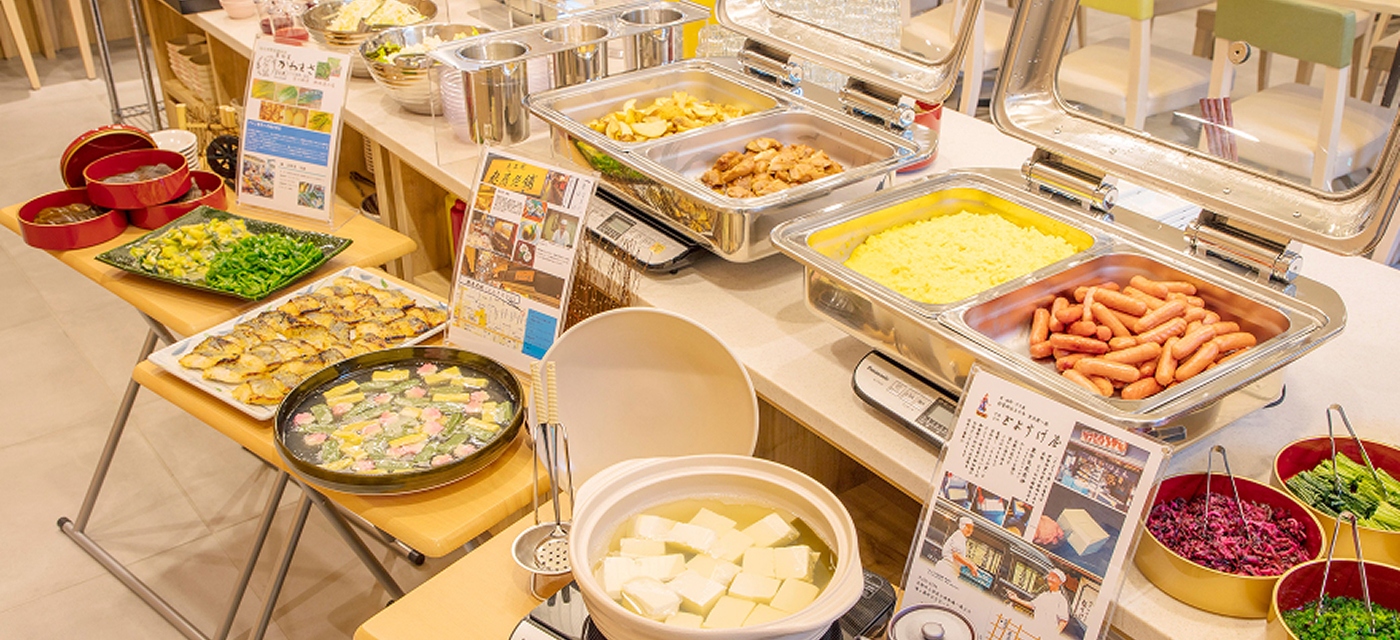 ホテル2階朝食会場にて、フレッサインの日替わりビュッフェ(和・洋食)を1,400円にてお召し上がりいただけます。
