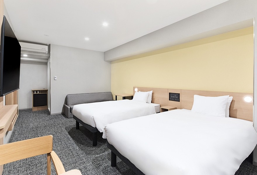 最も広い客室で、浴室とトイレ・洗面台は分離タイプです。室内のソファはベッドとしてご利用いただくことで最大3名様のご宿泊が可能です。ファミリーやお友達同士でのご宿泊に最適です。