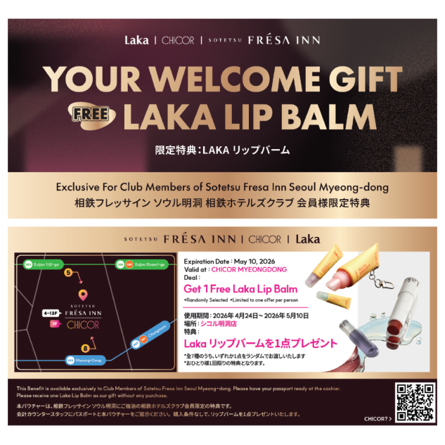相鉄フレッサイン ソウル明洞では、大切な会員様に特別な体験をお届けするため、韓国のビューティーブランドCHICOR(シコル)及びLaka(ラカ)との特別コラボレーションを実施いたします。