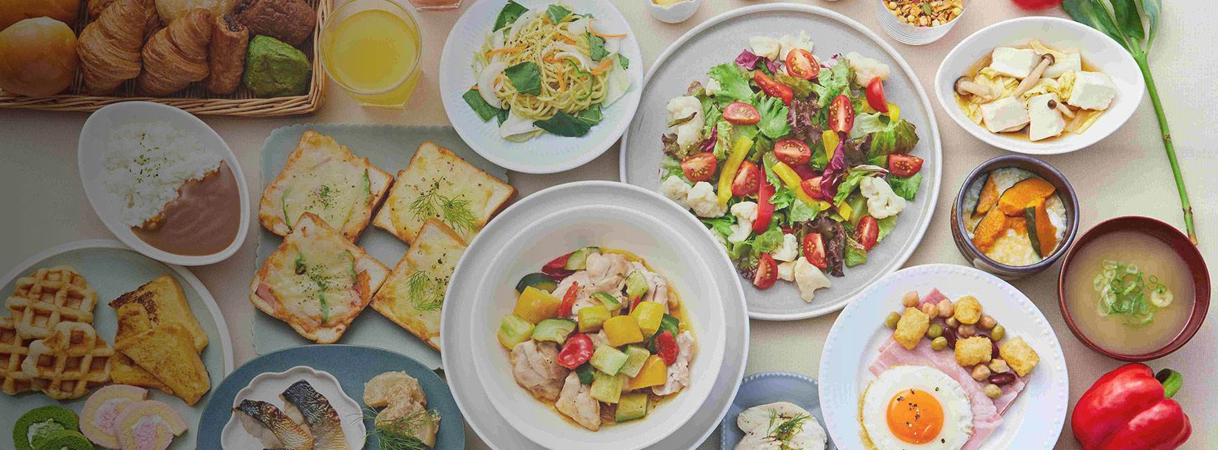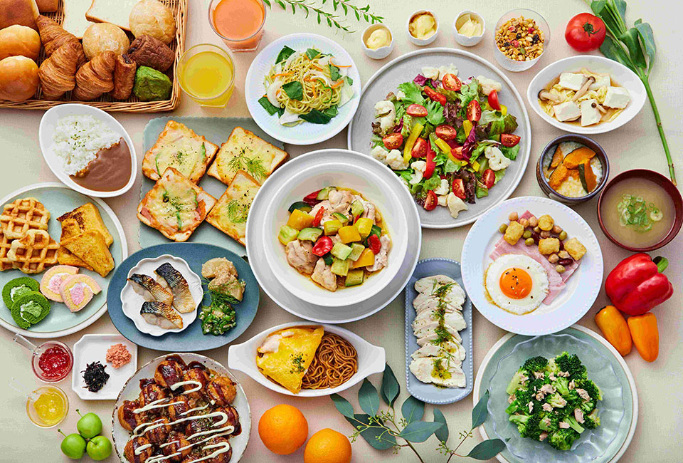 たこ焼きや焼きそば、ミックスジュースなど大阪ならではのメニューやヘルシーな和食を中心とした日替わりメニューの他、定番の卵料理やお肉料理、サラダ等をご用意しております。