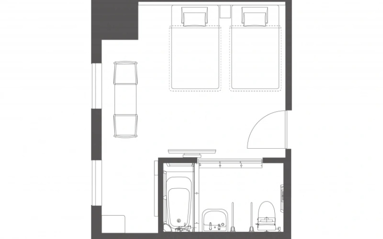 コンパクトなお部屋で、2名様でのご利用はもちろん、1名様でもご利用いただけます。ベッド下のスペースは荷物の収納としてご利用いただけます。