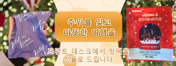 500엔 캐시백 대신 또 다른 혜택 5,000원 상품권 선물 상품권 이용가능 점포:SHINSEGAE백화점, SHINSEGAE면세점, emart, emart everyday, STARBUCKS(일부점포 제외)등‘페이셜 마스크’증정 체크인 시 페이셜 마스크를 증정합니다. ※체류 한 건당 인원수만큼 증정합니다. ※데이유즈 플랜은 대상에서 제외됩니다. ※회원 프로그램에서의 혜택은 공식 사이트, 공식 앱 및 전화로 예약하신 경우만이 대상입니다. 체크인 시에 회원 QR코드의 인증이 필요합니다. ※예고 없이 변경이 될 수 있으므로, 미리 양해 부탁드립니다. |