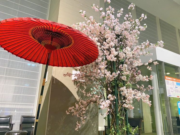 傘とベンチのご用意いたしましたので、花見の気分を感じてくださいー!♡