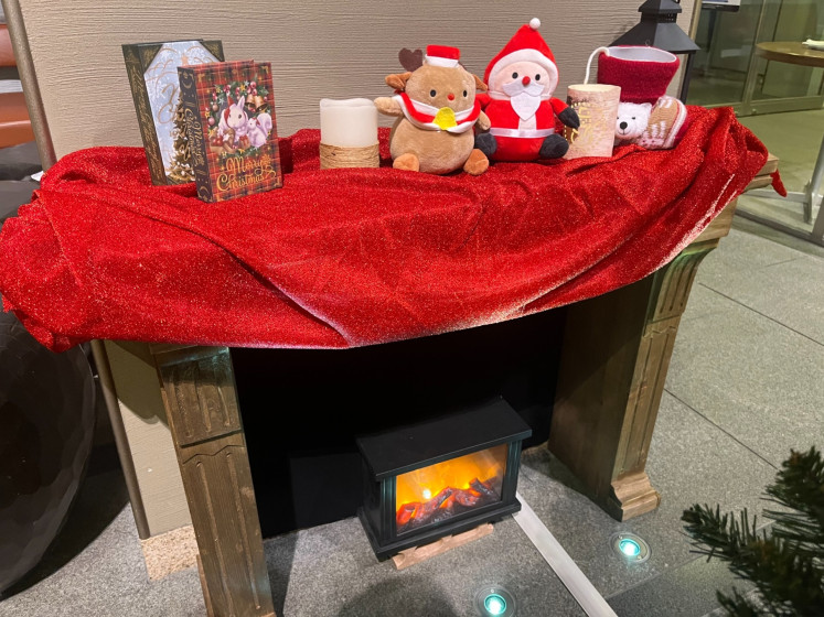 暖炉の上ではサンタさんとトナカイさんが見守っています。
