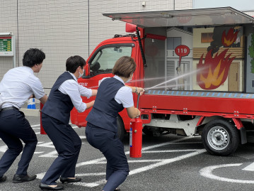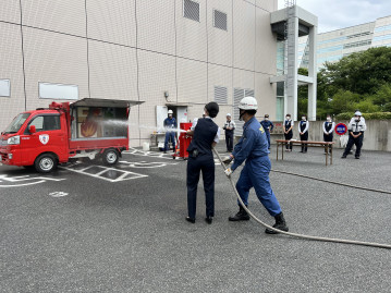 今回は「まちかど消防訓練車」が来館し、自衛消防講習と訓練を行いました。