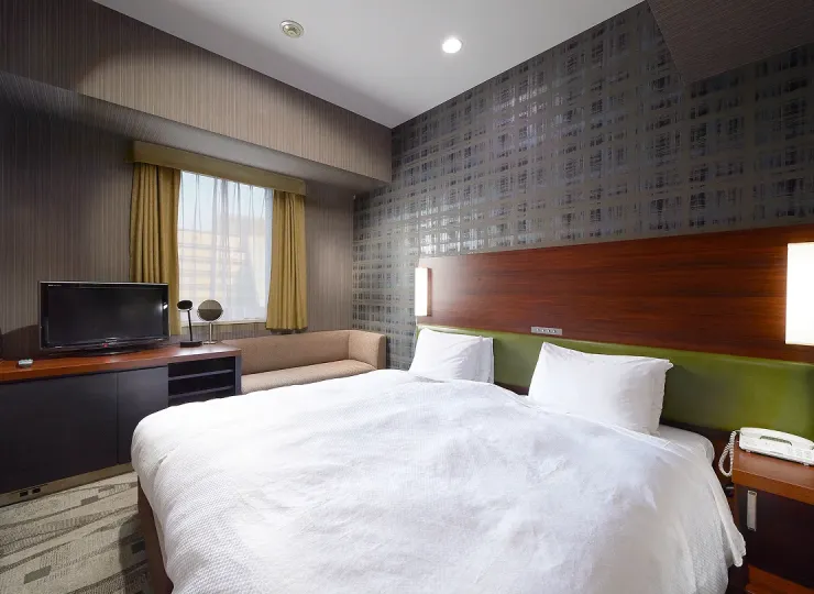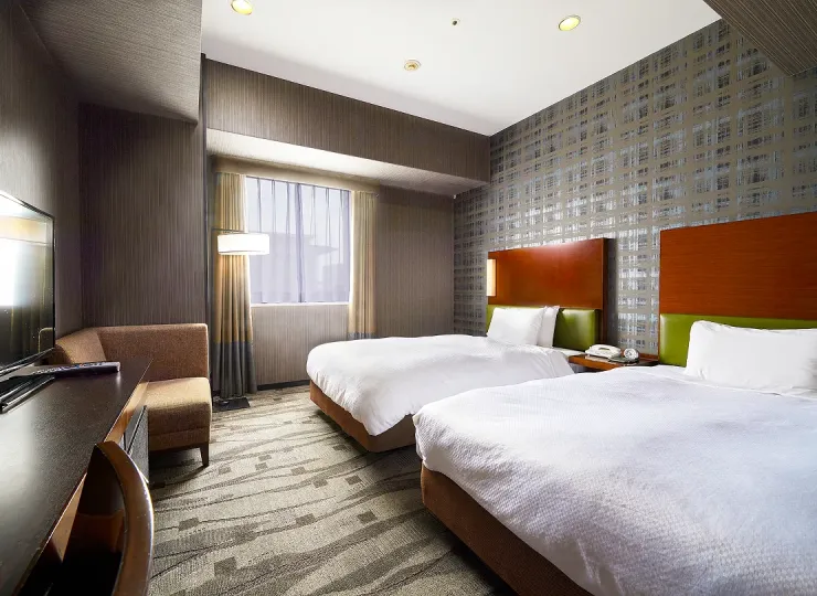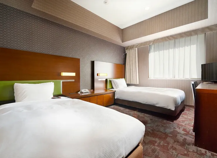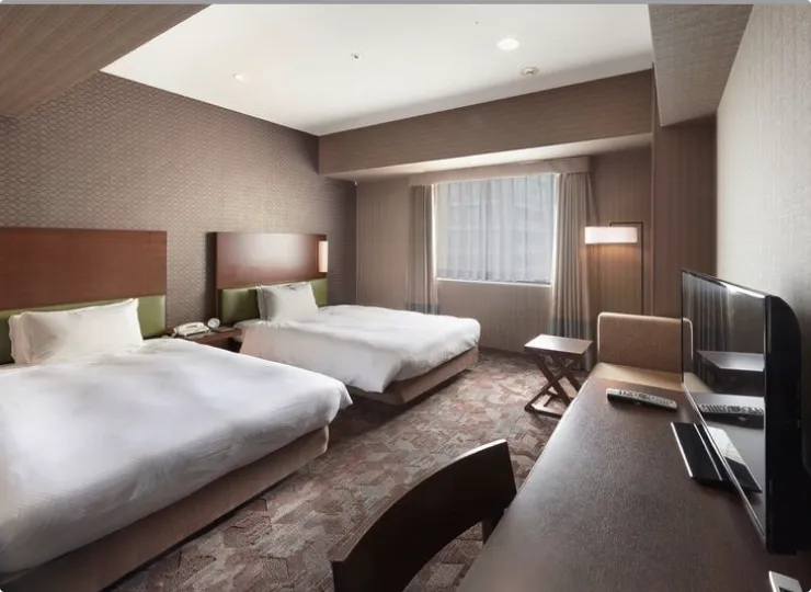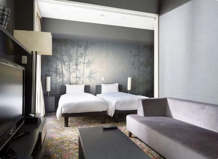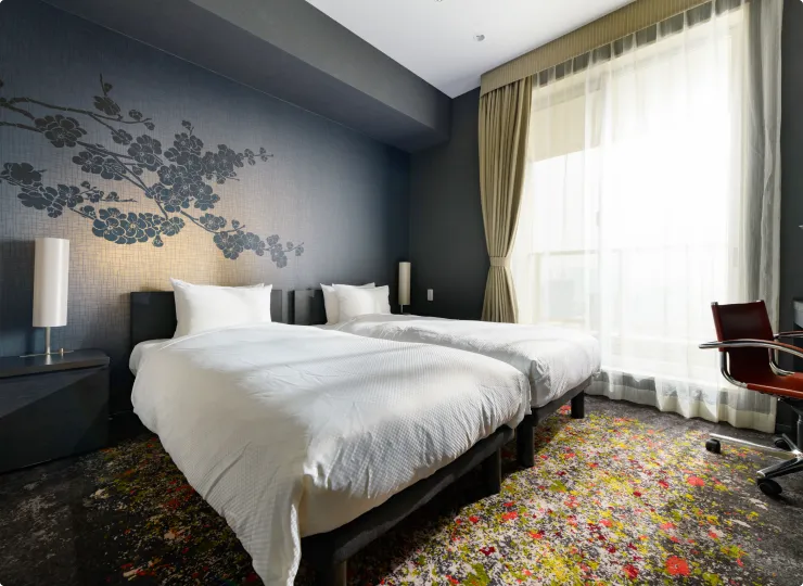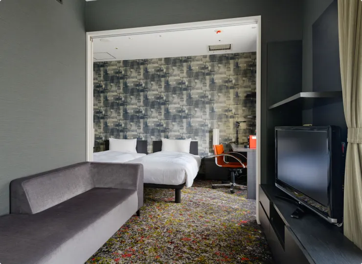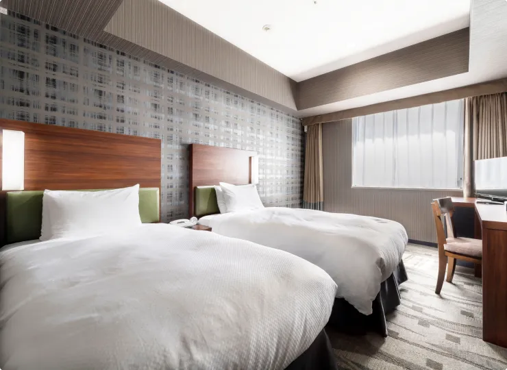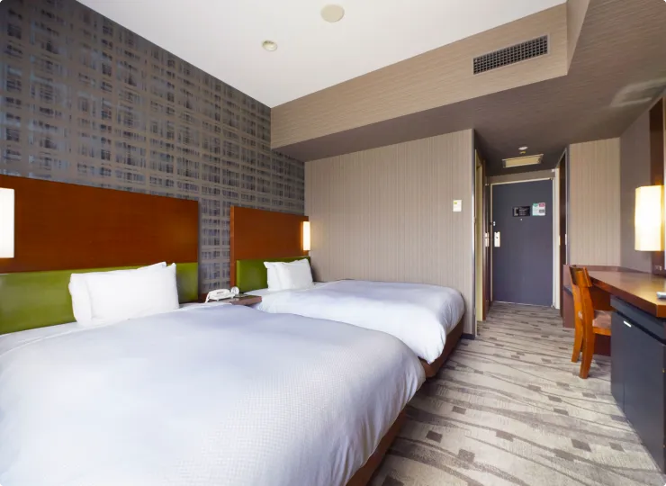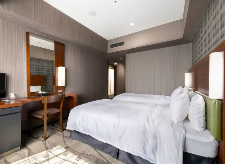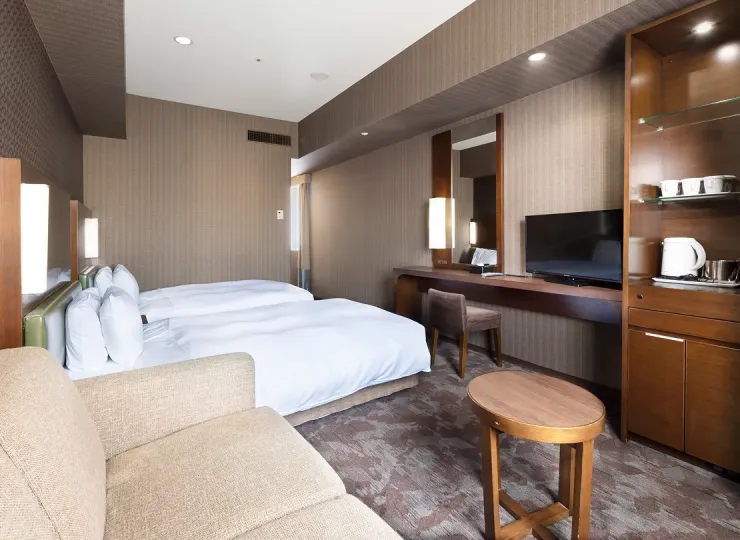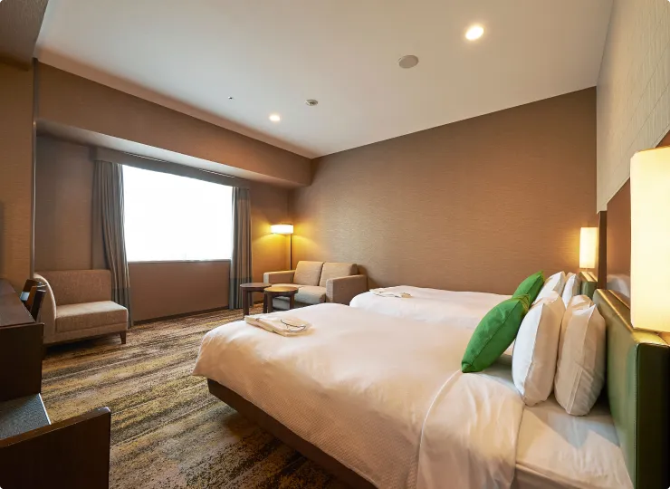 角部屋に位置しゆったりとした空間のツインルームです。ソファベッドとエキストラベッドのご利用で最大4名様までご宿泊が可能です。3名様でご利用になる場合の客室名称は「デラックストリプル」、4名様の場合は「デラックスフォース」となります。