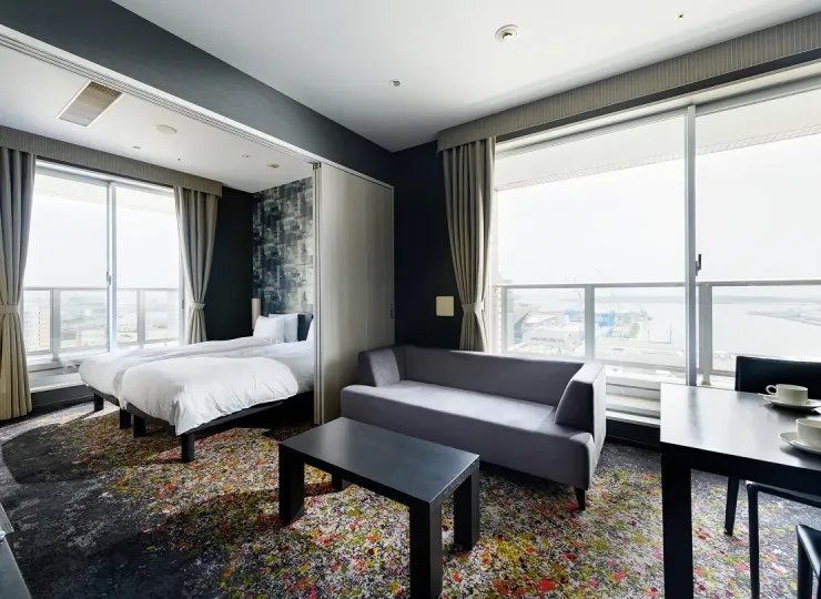 当ホテルで最も広く、お台場や湾岸の夜景を臨む海側に面したお部屋です。リビングルーム、キッチン、洗濯機を備えており、リビングルーム・ベッドルームそれぞれから眺望をお楽しみいただけます。
