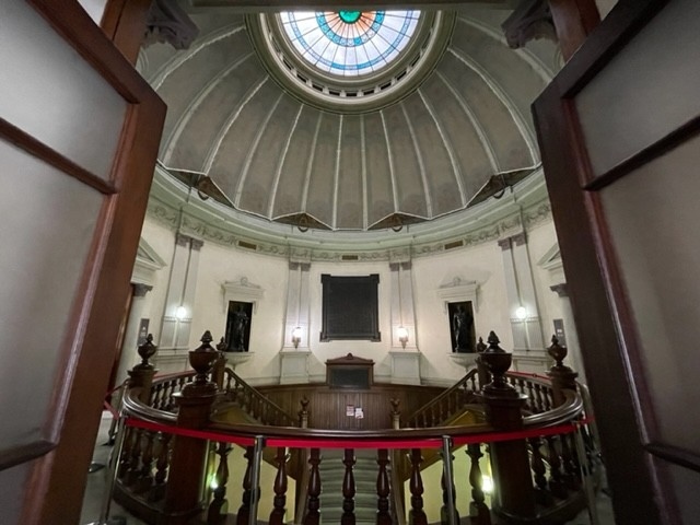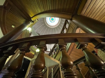 階段はふむとぎしぎしといってきしみまくりです。天井のドームから差し込む太陽光がステンドグラスを通して図書館全体に採光となり柔らかな空気を作ります。