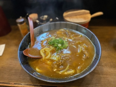 カレーはややスパイシーで食欲をそそります。濃厚なカレーの風味の中に出汁が香り大変美味しい一杯でした。
