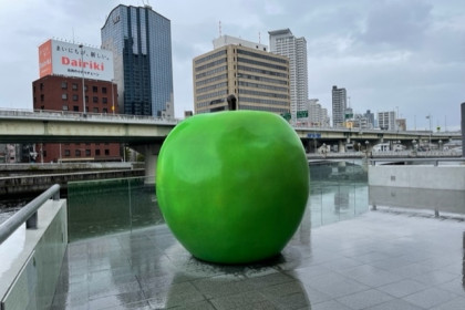 子どもたちをエントランス・ポーチで出迎えるのは、「永遠の青春」と名付けられた謎の青リンゴのオブジェです。