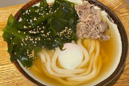 シンプルなお出汁に生ワカメが薫り高く、温玉とお肉が更に食欲を掻き立てます。