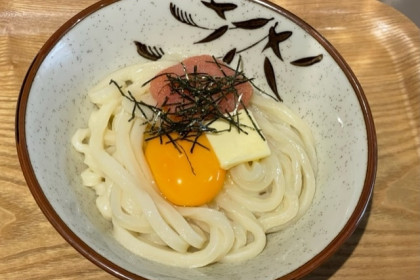 これを考案した人がすごいなぁとつくづく思う最高のマリアージュです。海苔の香りも良く非常に美味しい一杯です。うどんの歯ごたえも良く、バターと明太子の絡まったソースに卵黄が混ざりそれはもう至福のひと時を過ごすことが出来ます。