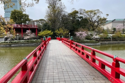この橋は和気橋といい、天王寺公園の中にある河底池にかかる赤い橋として愛されています。