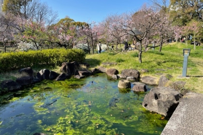 日本庭園は整備されており、点在する桜を楽しむ他、レジャーシートを敷いて飲食することも可能です。