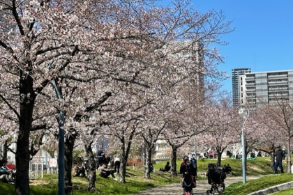 桜並木の下は芝生になっているので、座ってお花見を楽しむこともでき、休日には親子連れをはじめ多くの人で賑わいます。