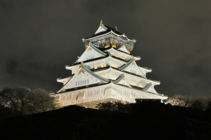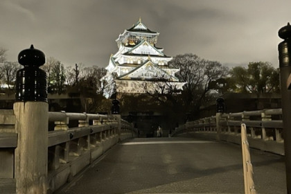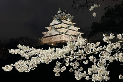 夜は大阪城自体のライトアップが美しく、園内の桜と大変美しい景観にうっとりします。