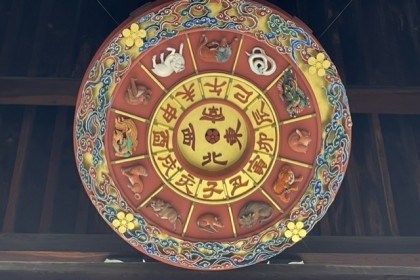 門を通り抜けて見上げると、「方位盤」があります。東京は浅草の雷門と同じように十二支で方位を表し、西の方位に鳳凰が描かれています。