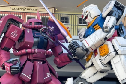 同施設の中でも、撮影スポットとして大人気なのが、関西初登場となるガンダムスクエアの前に現れた、ガンダムvsシャア専用ザクの巨大立像なのです。赤い色のザクというモビルスーツと主人公アムロレイさんの操縦するガンダムというモビルスーツとの攻防を併設しているガンダムカフェにて眺める事ができます。