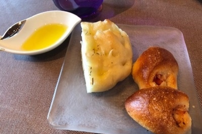 ベーコンエピやフォカッチャです。あたたかくて美味しい。パスタソースにまたイタリアンらしくオイルにつけて食べても美味しいですね。