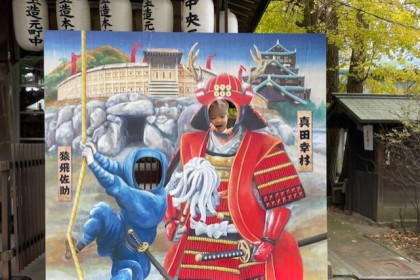 可愛い息子殿に幸村パネルに入っていただきました。隣の躍動感のある青い忍者は猿飛佐助さんです。