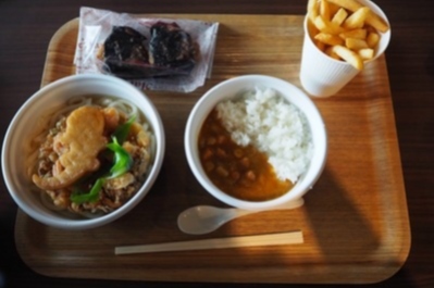 ペンギン風の海苔をまいたおにぎり。お子様カレー。オオサンショウウオうどんです。