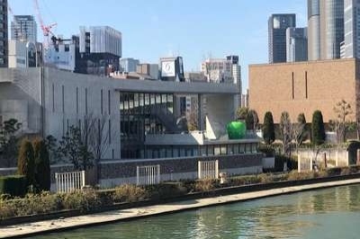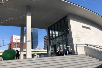 なにわ橋の川べりから見た図書館の風景は大きな青りんごのオブジェが目を引きます。