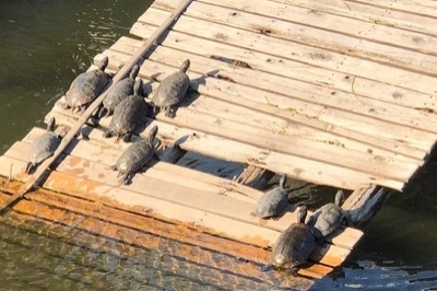 これが噂の「亀の甲羅干し」です。亀は変温動物で自分で体温調整が出来ないので、一定時間お日様にあたってほっこりとしているのですね。