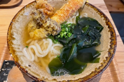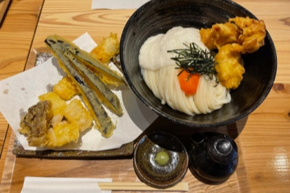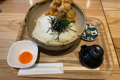 こちらは、とり天生醤油うどんです。880円。もりもりと食べたくなる一品です。