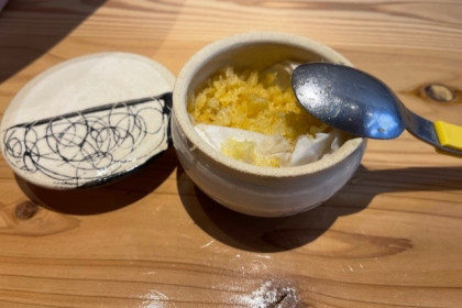 卵黄が中央に一個乗っかっており、鳥の天ぷらは3つと生醤油と山芋の抜群のマリアージュを