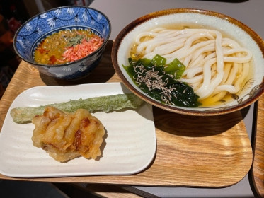 桜エビの香るスパイシーなカレーに冷かけうどんをつけて食べるつけ麺スタイルです。