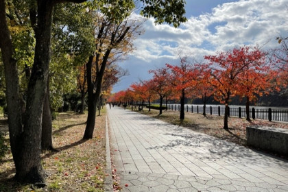 紅葉を楽しみながら、散策する家族連れやカップル、ランニングする方など、地元にも愛される素敵な公園でした。